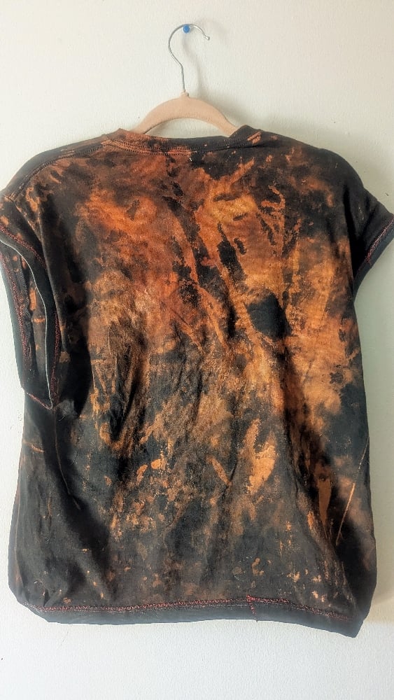 Hand-painted bird skeleton shirt featuring a bleached base washed in deep red and earthy brown hues.