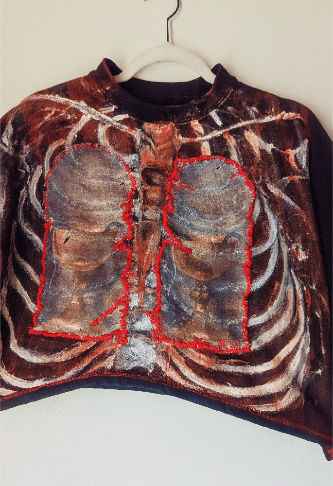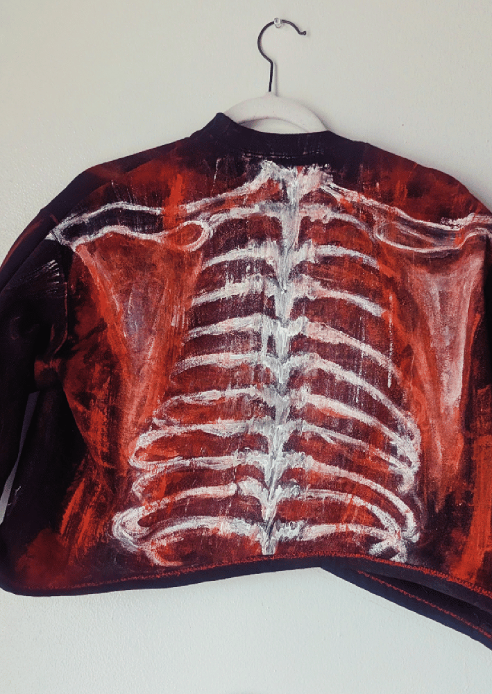 Hand-painted ribcage design on both the front and back, featuring a hand-dyed distressed wash in red with layered brown and yellow hues.
