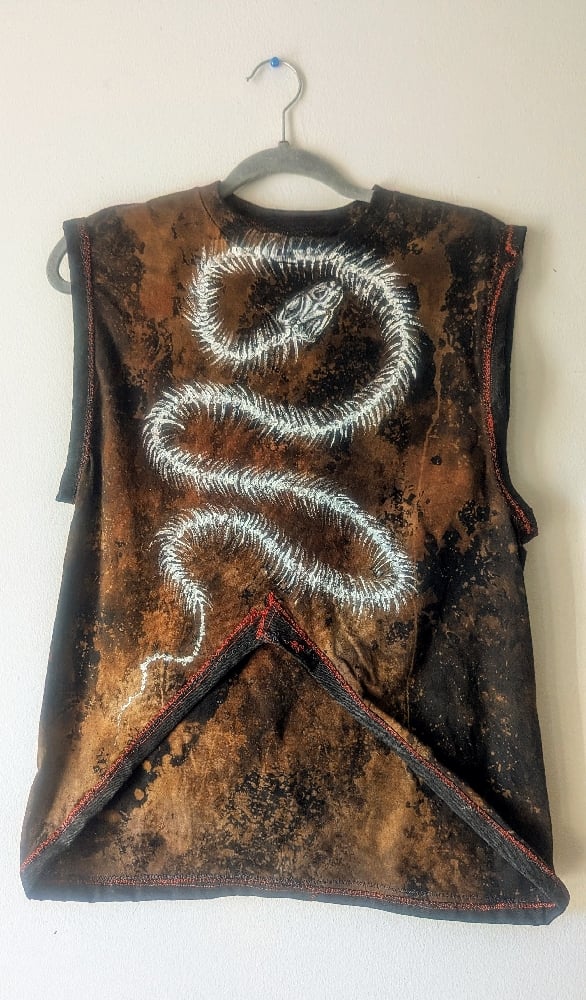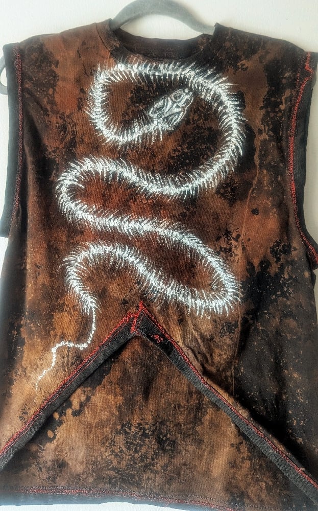 Hand-painted serpent skeleton winding down the front of a distressed, bleach-treated tee.