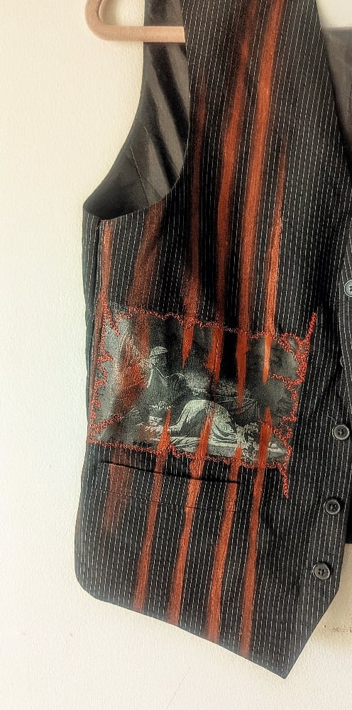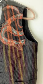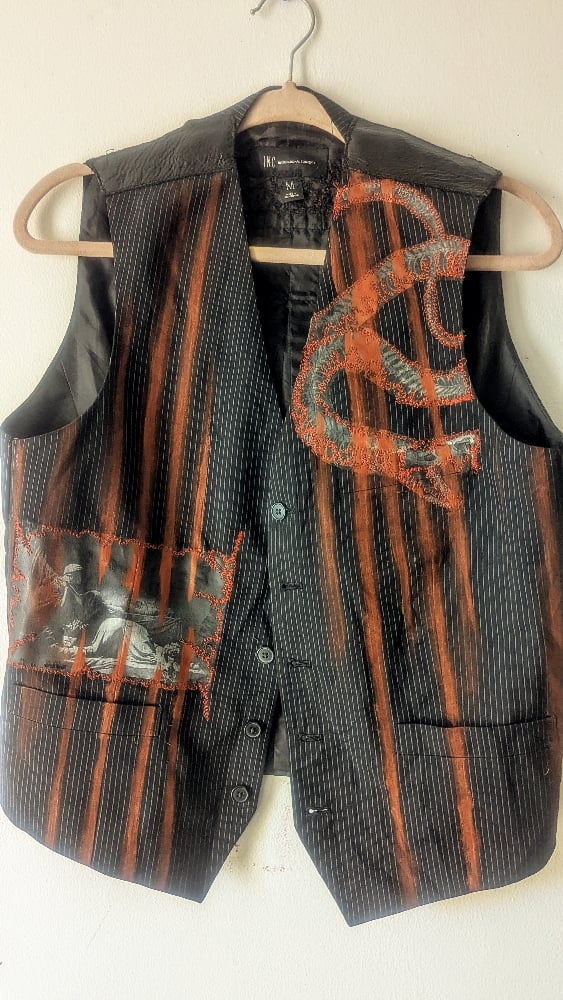 Joy Division–inspired medium vest featuring hand-stitched red detailing and a handmade serpent patch.