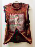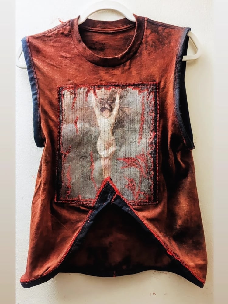 Black basic cotton t-shirt, transformed into a sleeveless, repurposed piece featuring a dark fushcia, red hand-dyed tone.