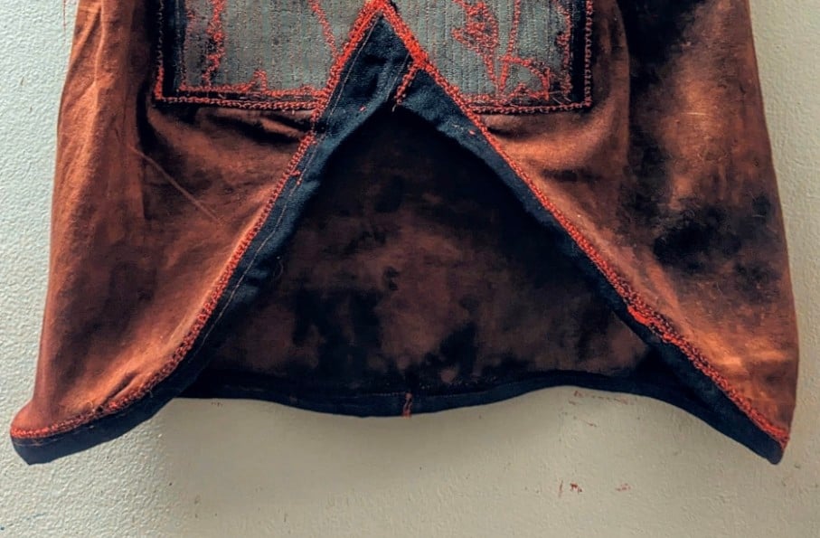 The bottom hem & sleeves are asymmetrically cut into a sharp V-shape, also accented with red stitching, adding an edgy, deconstructed vibe. The overall look is bold, alternative, and artistic—