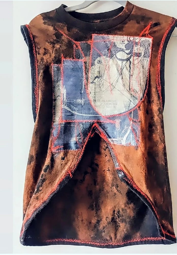 distressed into a sleeveless top reimagined with raw edges and chaotic red stitching.