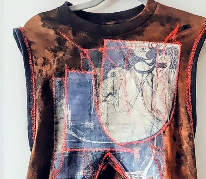 Drawing by Aubrey Beardsley c. 1812 handmade patchwork becomes the centerpiece, stitched red stitching in a bold contrast against the dark, dyed fabric.